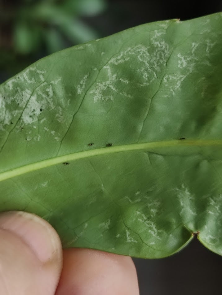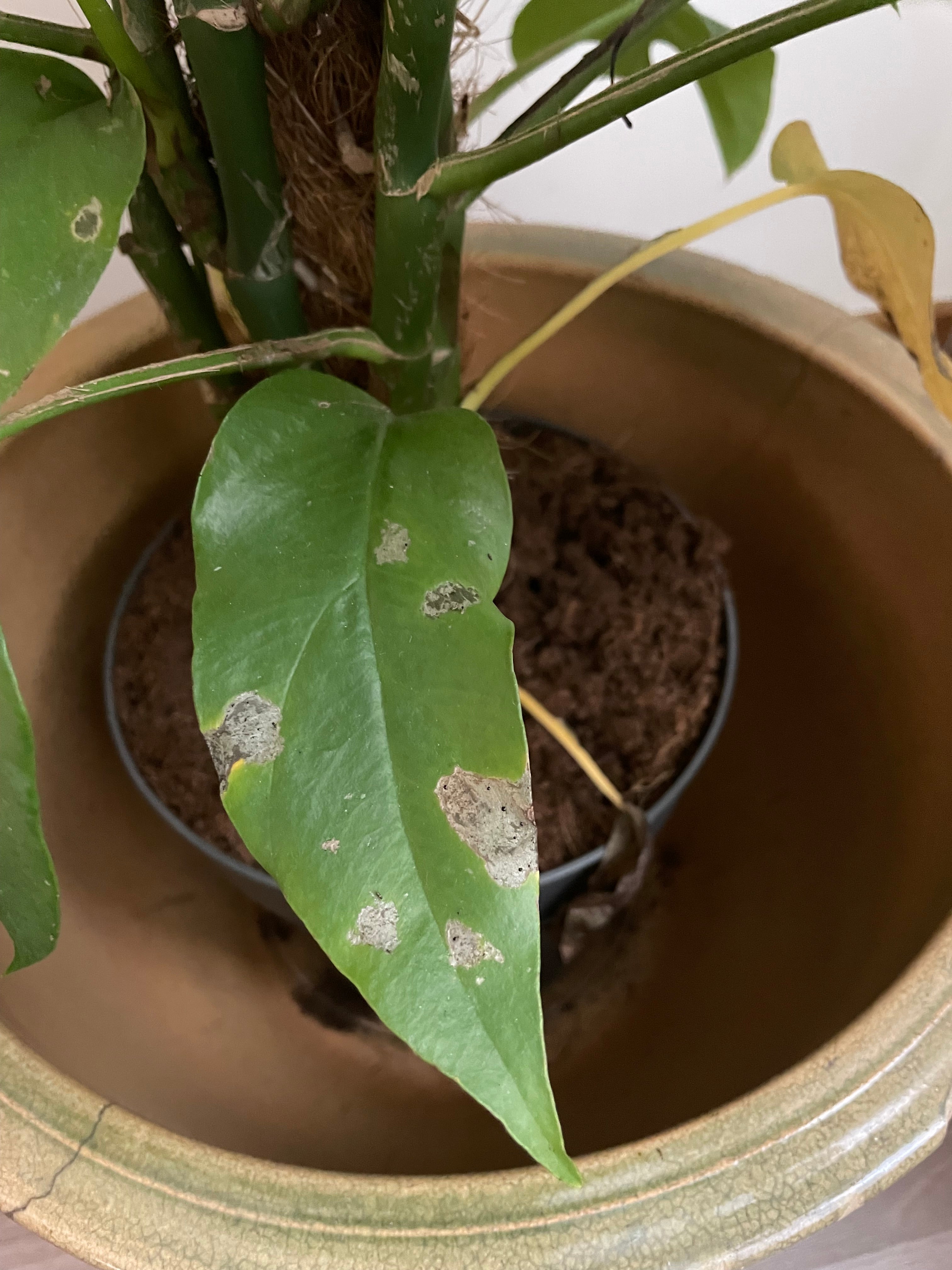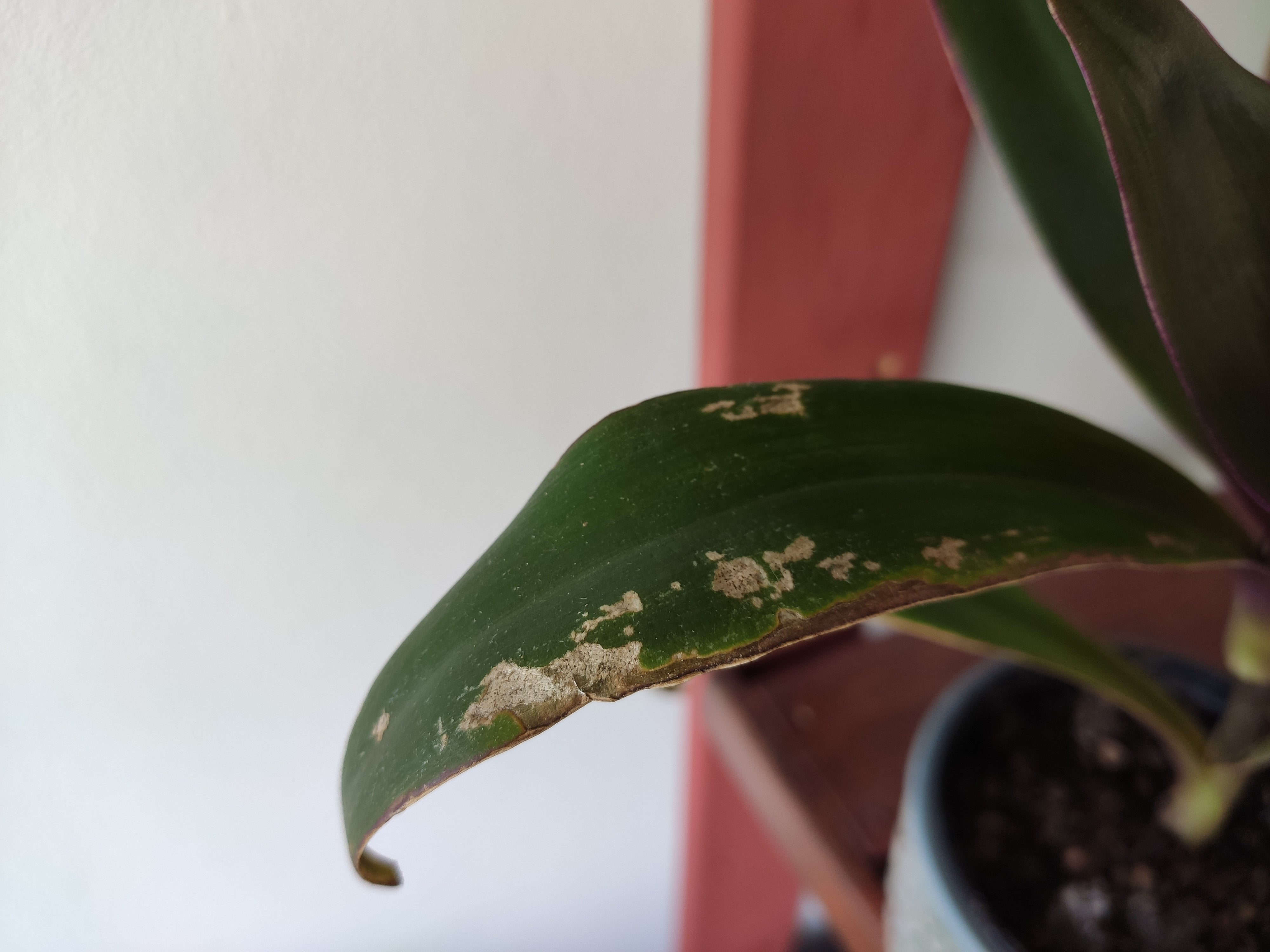 Zie je lichtgrijze of bruine vlekken op de bladeren met zwarte puntjes erin? Dan heb je te maken met trips. Trips is een langwerpig insect dat plantensap zuigt uit de bladeren. Hierdoor sterven de plantencellen af en kleuren ze grijs. De zwarte puntjes in deze plekken zijn de uitwerpselen van trips.