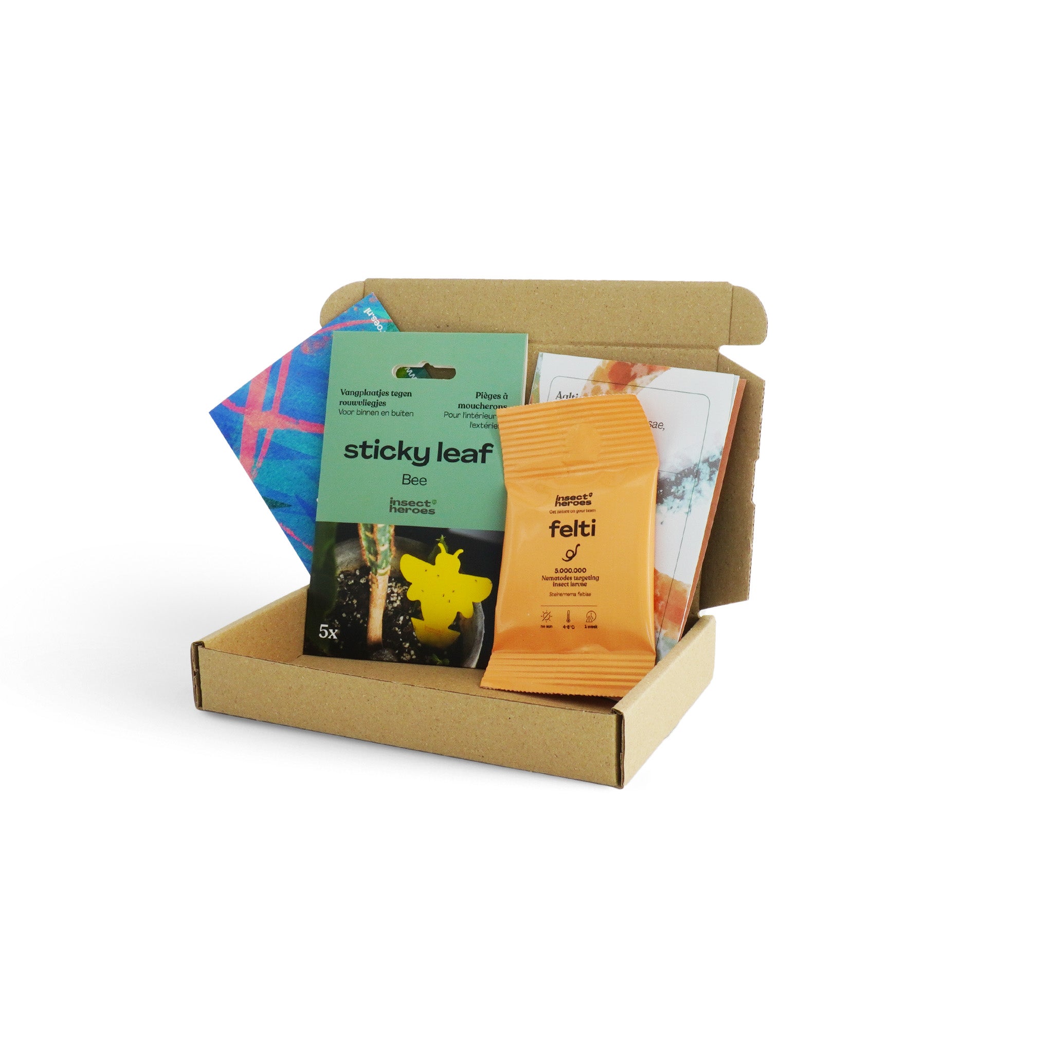 De Combi Deal bevat 1 zakje Felti (5 miljoen aaltjes) en 5 Sticky Leafs: genoeg voor 5 tot 10 kamerplanten.